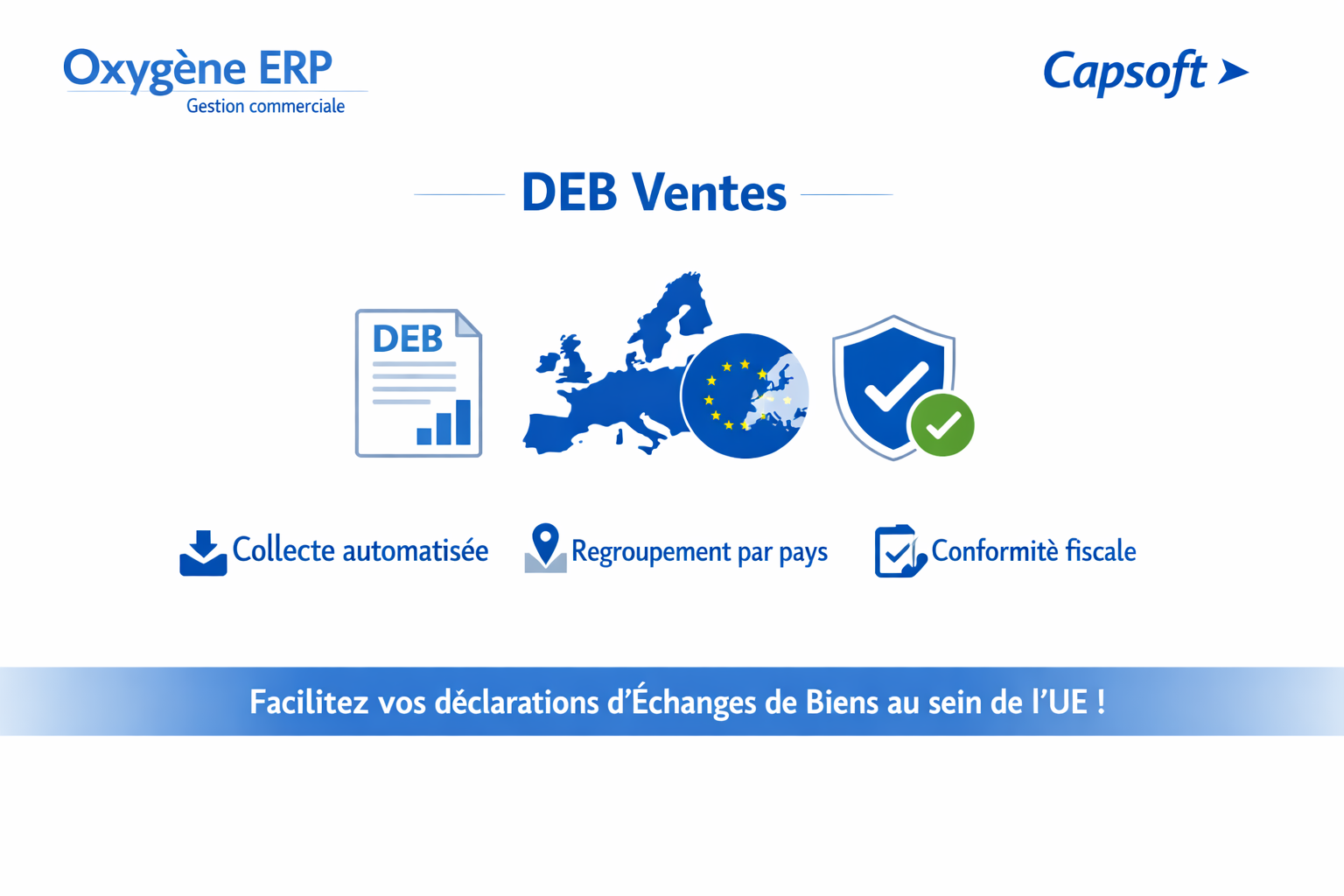 Avec Oxygène et son composant métier DEB - Ventes, simplifiez la gestion de vos échanges intra-CEE et assurez une déclaration rigoureuse et conforme aux exigences fiscales !