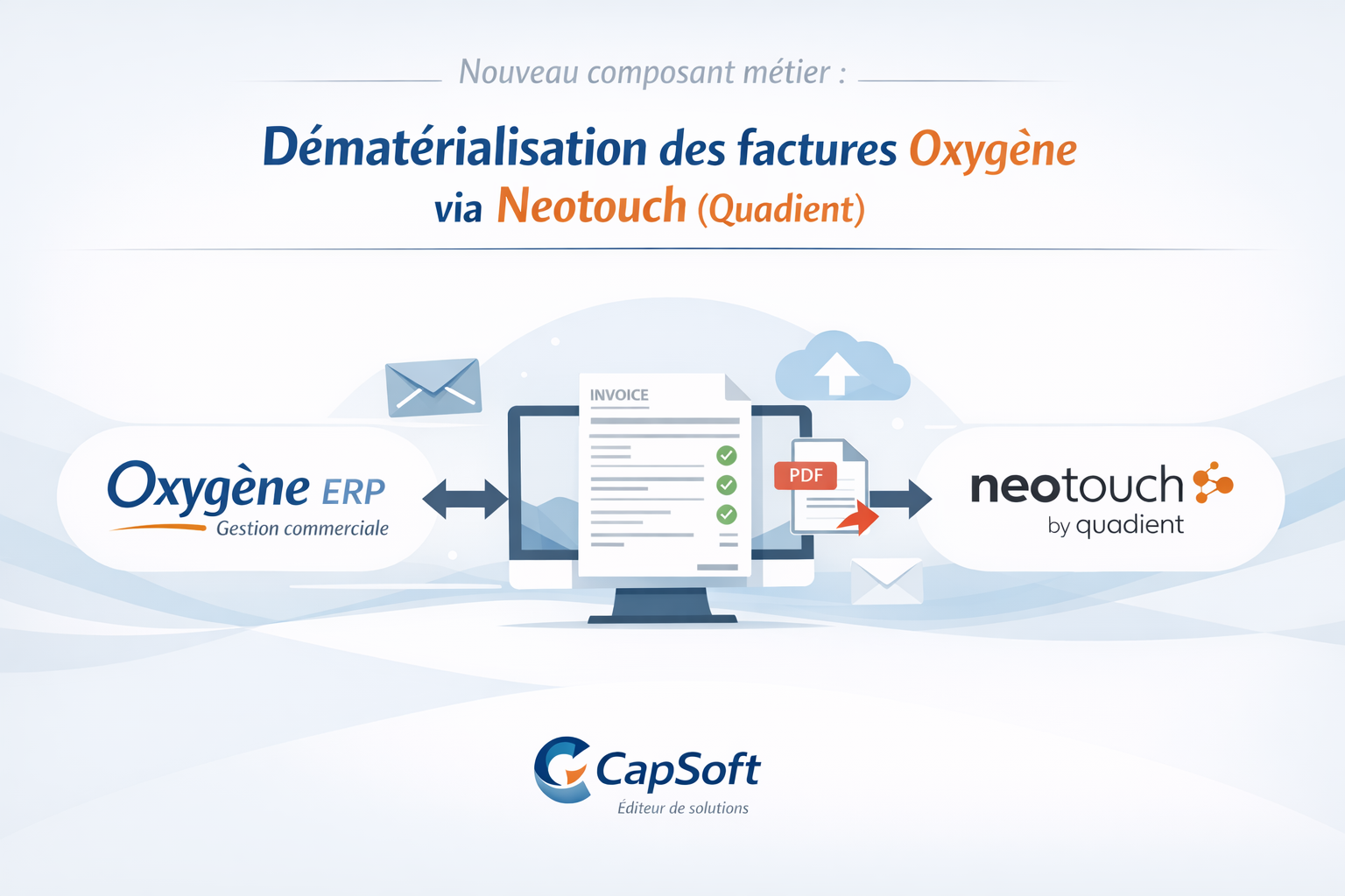 Cet objet métier est dédié à la dématérialisation complète des factures clients émises depuis l’ERP Oxygène, en s’appuyant sur la plateforme Neotouch de Quadient. Il permet aux entreprises utilisant la plateforme NeoTouch avec Oxygène de sécuriser et automatiser l’envoi de leurs factures, tout en anticipant les obligations réglementaires liées à la facturation électronique.