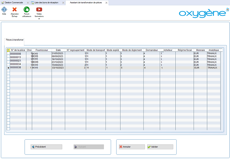 Composant métier additionnel Oxygène, le regroupement des BRF (Bons de réception fournisseurs) sur factures d'achats fournisseurs consiste à identifier la "faisabilité du regroupement" par un même indice de regroupement l'ensemble des documents susceptibles d'être transformés dans un même document cible.